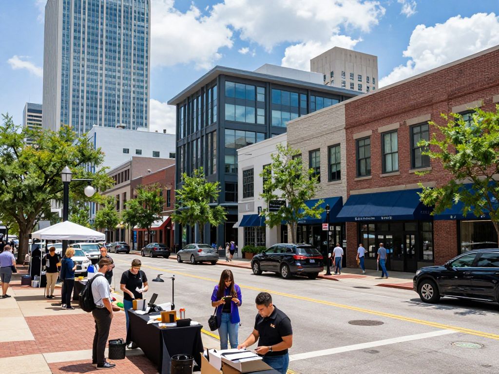 Business district in Charleston SC with modern buildings and people