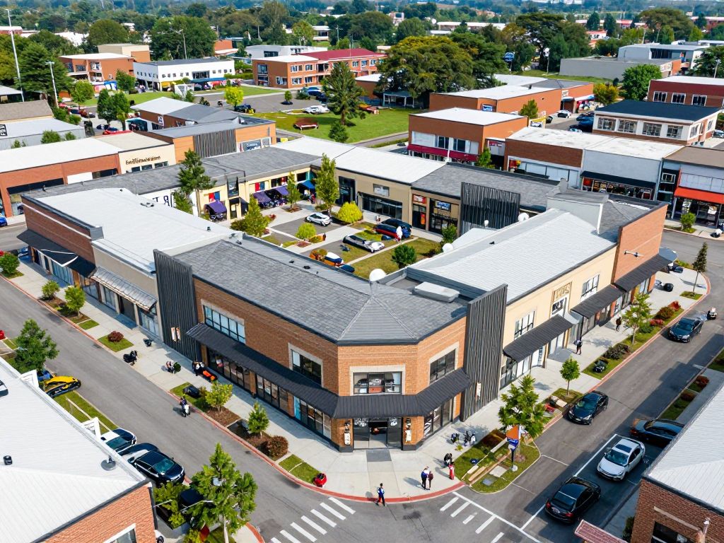 Aerial view of retail strip centers with community engagement